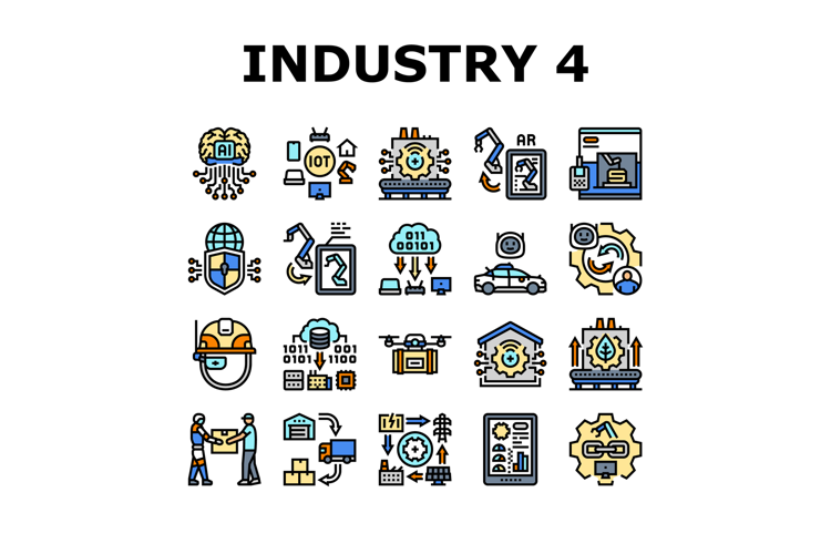 industry 4.0 automation robotics icons set vector. cybersecurity bigdata, analytics, cloud smart, connectivity, sensors industry 4.0 automation robotics color line illustrations