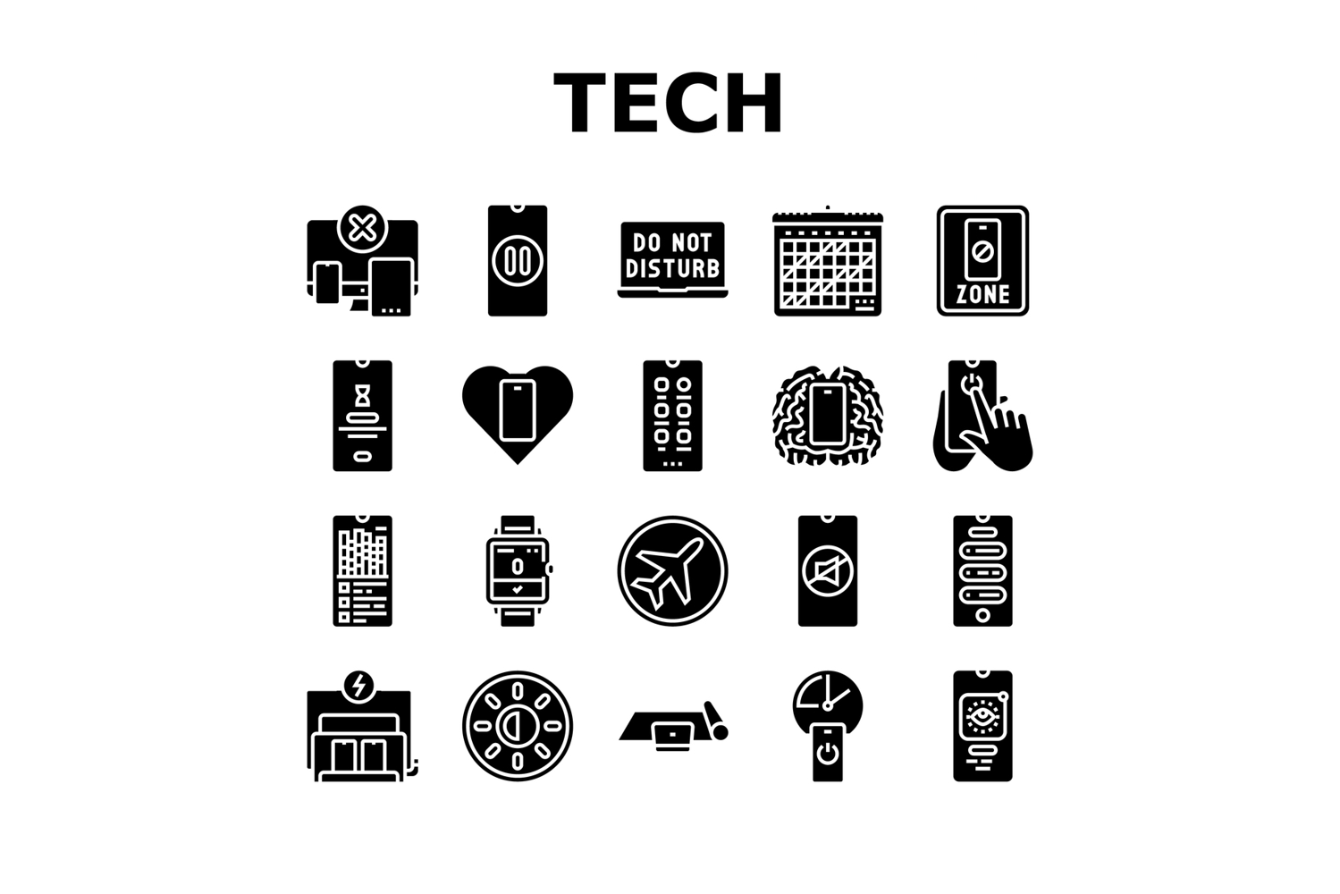 mindful tech engagement balance icons set vector. technology awareness, focus, presence, digital, wellbeing, connection, distraction mindful tech engagement balance glyph pictogram Illustrations