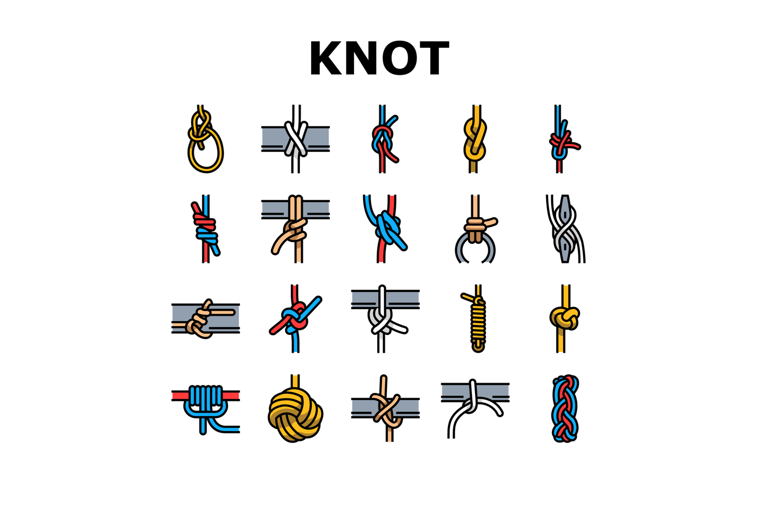 nautical knot rope marine icons set vector. sailor anchor, mooring splice, rigging cleat, buoy, dock, line, hitch, lanyard nautical knot rope marine color line illustrations