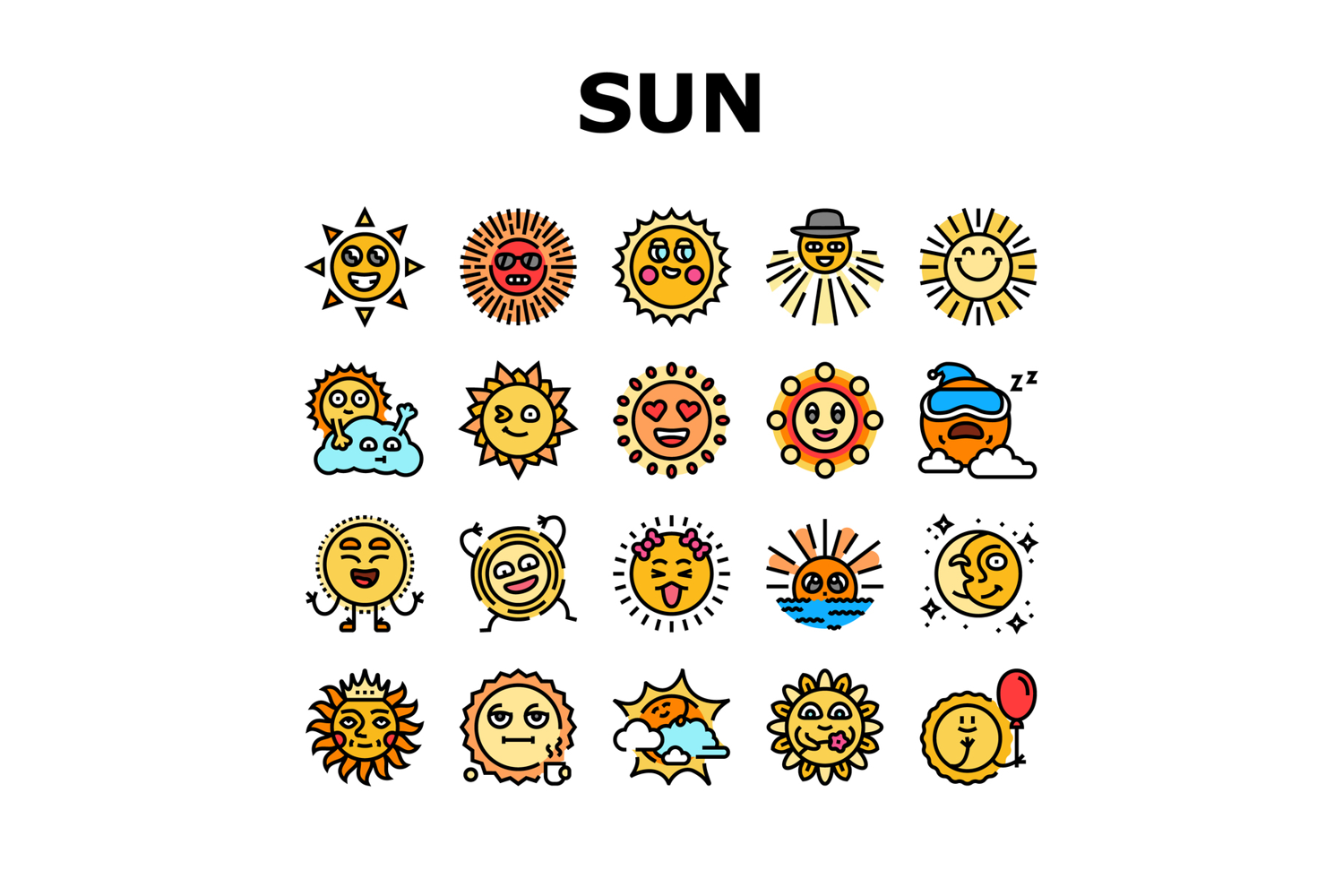 cute sun character sunny icons set vector. adorable, kawaii cheerful, bright, smiley, radiant playful, happy, cartoon, charming cute sun character sunny color line illustrations