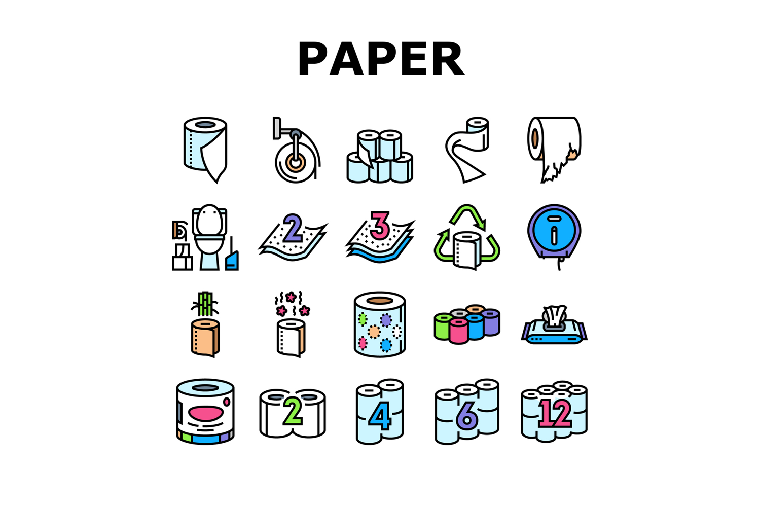 toilet paper tissue roll soft icons set vector. absorbent, bathroom, hygiene, clean, comfort, brand, ecofriendly, recycled, septic toilet paper tissue roll soft color line illustrations