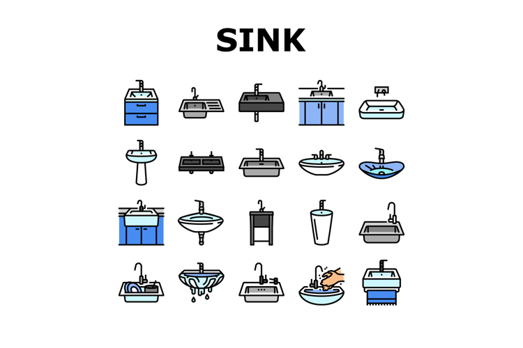 sink porcelain drain faucet icons set vector. basin, plumbing undermount, vessel, pedestal countertop, installation, overflow sink porcelain drain faucet color line illustrations