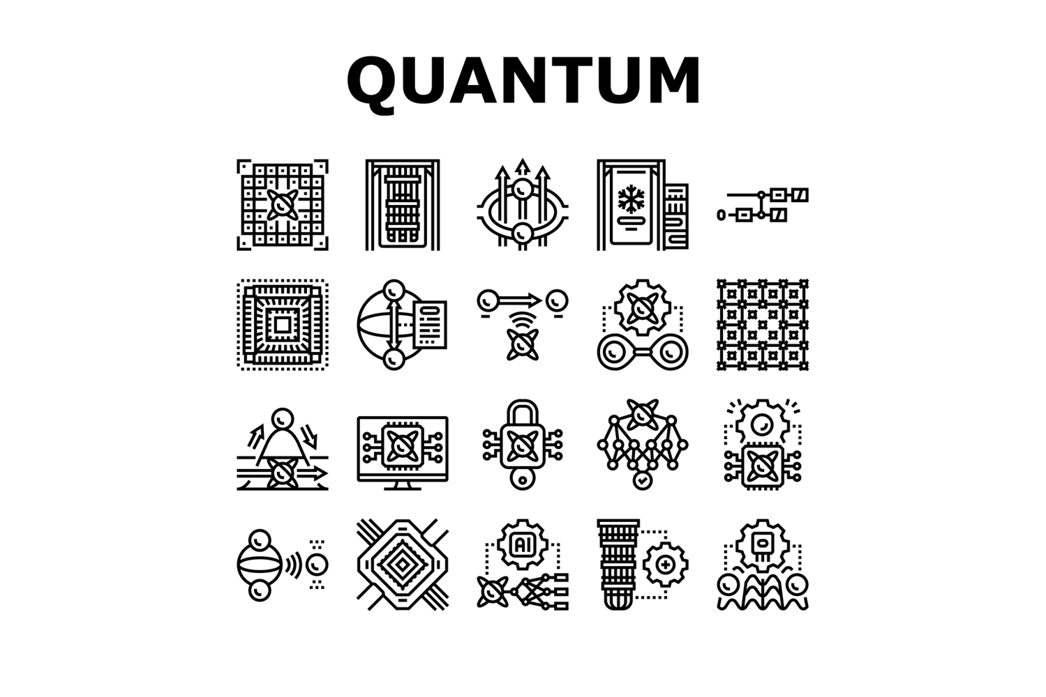 quantum computer qubit icons set vector. superposition, entanglement, decoherence algorithm, cryptography simulation quantum computer qubit black contour illustrations