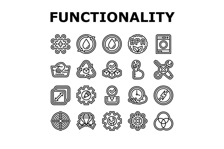 functionality features product icons set vector. usability, efficiency, reliability scalability, compatibility, interoperability functionality features product black contour illustrations