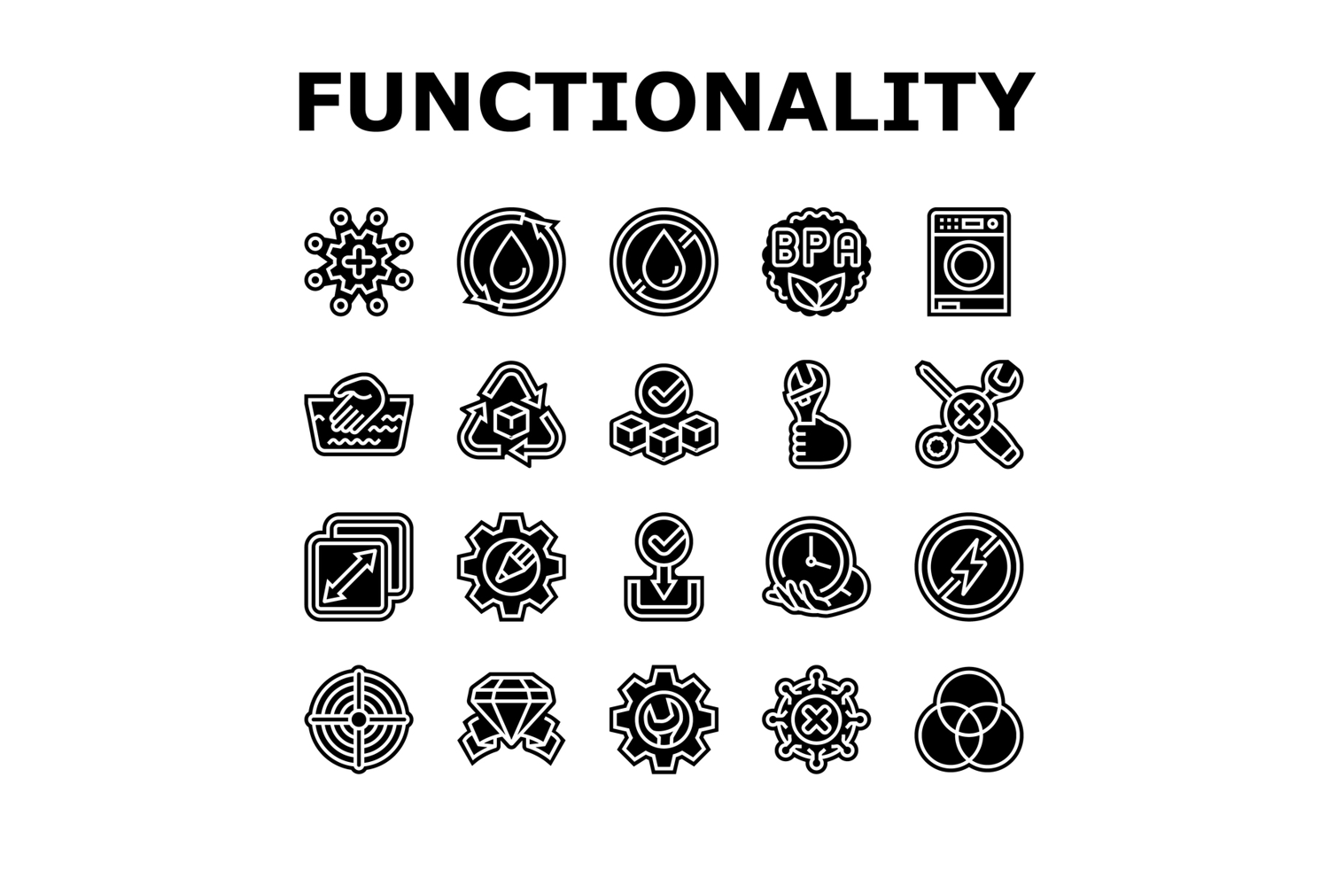 functionality features product icons set vector. usability, efficiency, reliability scalability, compatibility, interoperability functionality features product glyph pictogram Illustrations