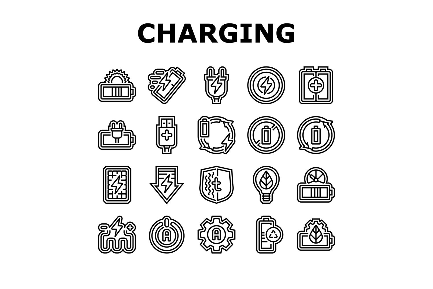 energy charging product icons set vector. powerbank, adapter, cable wireless, solar fast, portable, usb, battery, dock station energy charging product black contour illustrations