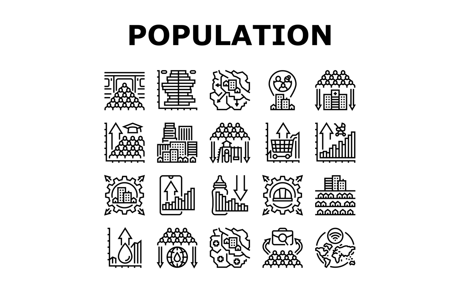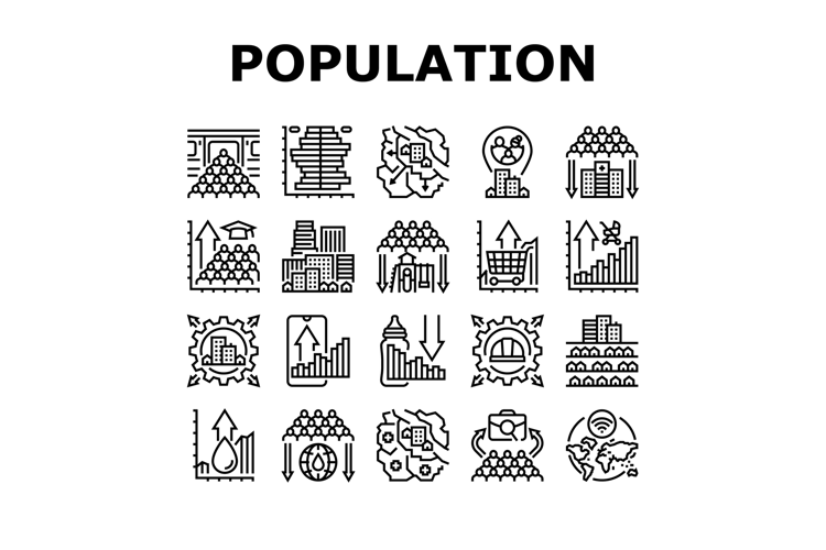 population growth icons set vector. demographics urbanization, overpopulation resources, migration, fertility, mortality population growth black contour illustrations