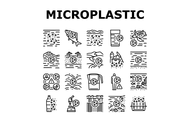 microplastic pollution ocean icons set vector. environment, contamination, ecosystem marine, debris, waste toxicity microplastic pollution ocean black contour illustrations