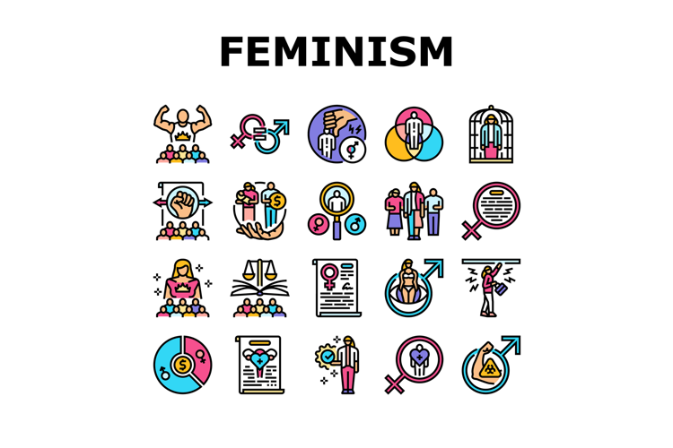 feminism patriarchy gender icons set vector. rights, intersectionality, activism, misogyny, solidarity, diversity, inclusion feminism patriarchy gender color line illustrations