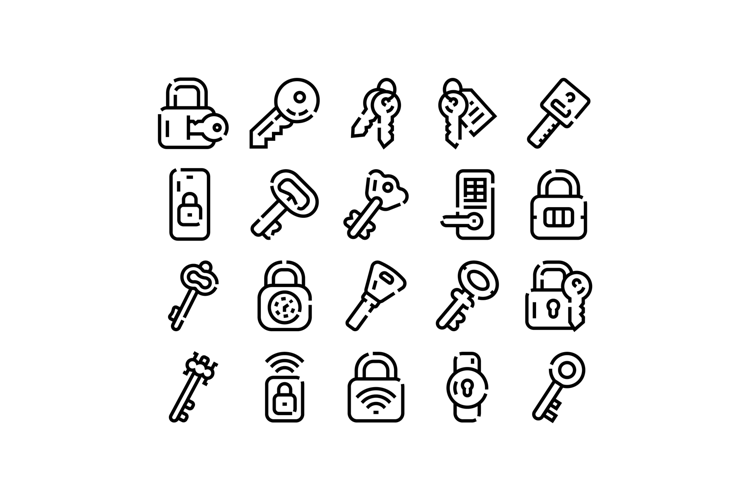 Collection of outline icons depicting various keys, padlocks, smart locks, digital access devices, and keyholes, representing concepts of safety, privacy, and protection