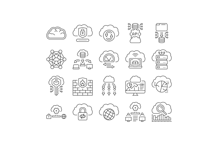 cloud computing virtualization icons set vector. scalability infrastructure, storage security, deployment automation, networking cloud computing virtualization black contour illustrations