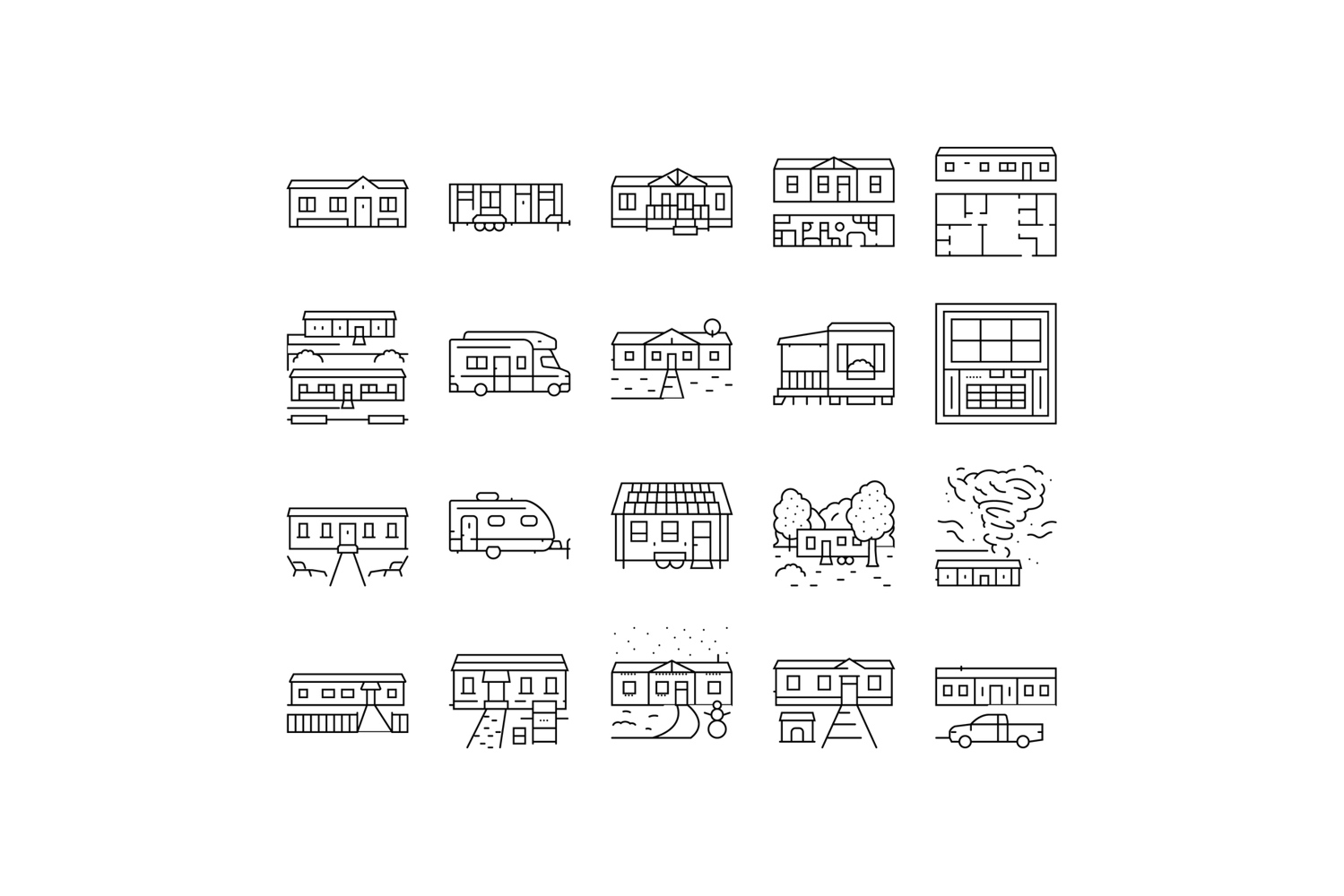 mobile home trailer, camper icons set vector. manufactured modular, tiny park, community prefab, transportable portable downsizing mobile home trailer, camper black contour illustrations