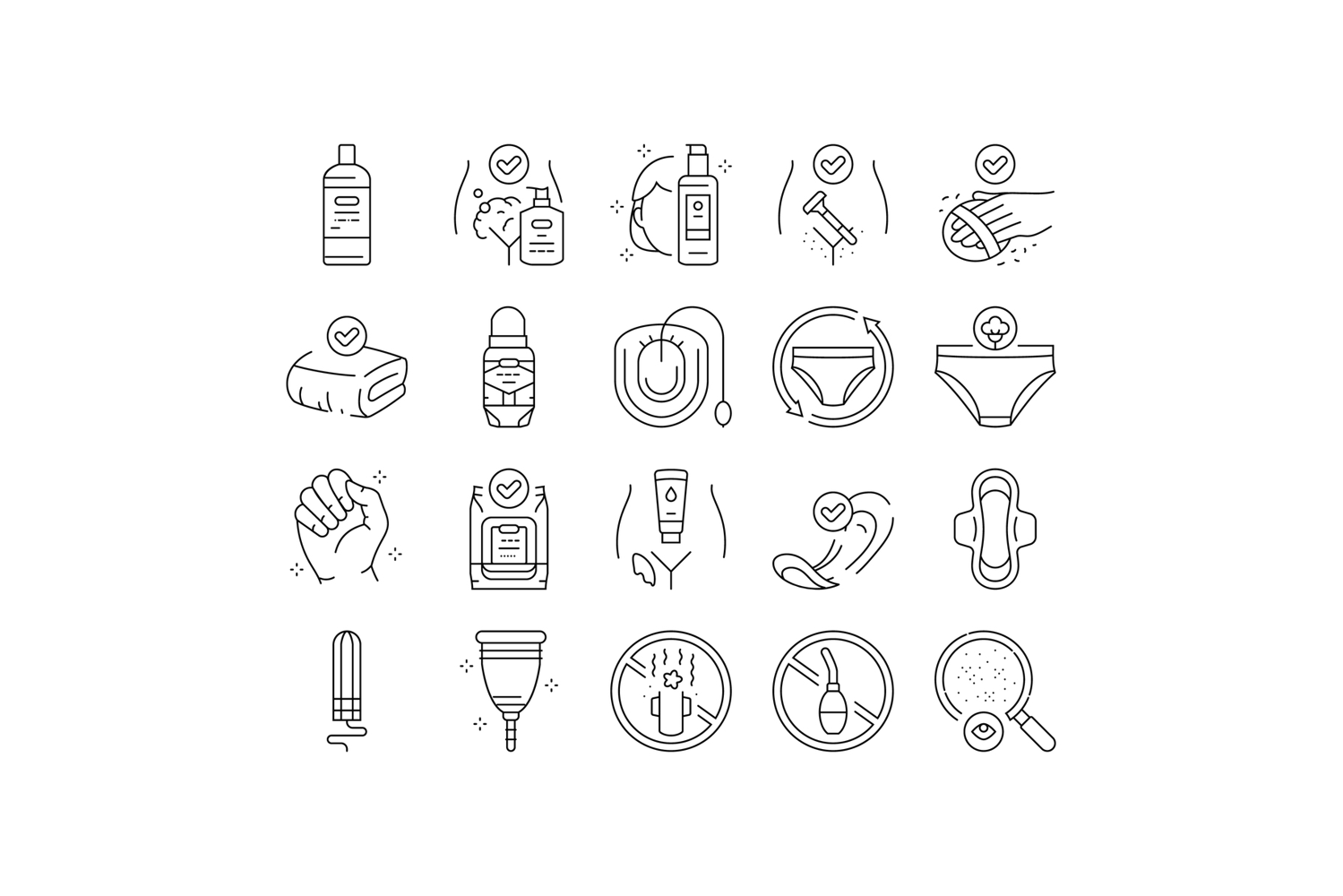 female intimate care hygiene icons set vector. menstruation periods, menstrual, wellness, health comfort protection, cleanliness female intimate care hygiene black contour illustrations