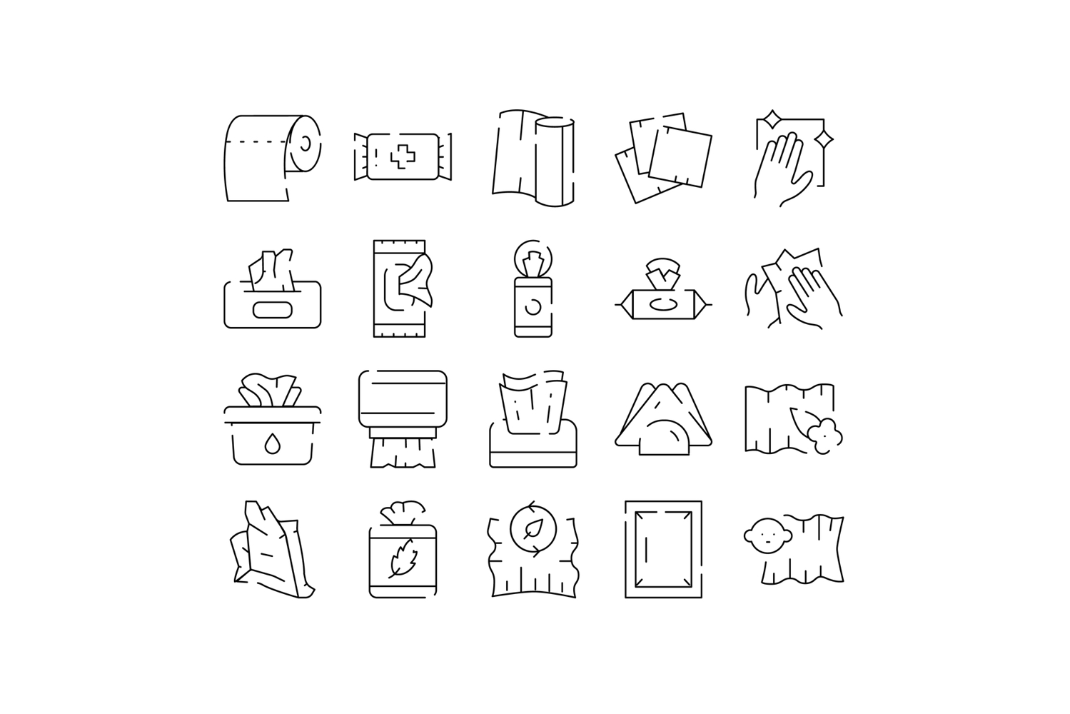 Collection of line icons depicting various wipes, tissues, and paper products for hygiene, cleaning, and healthcare, showcasing different packaging and uses
