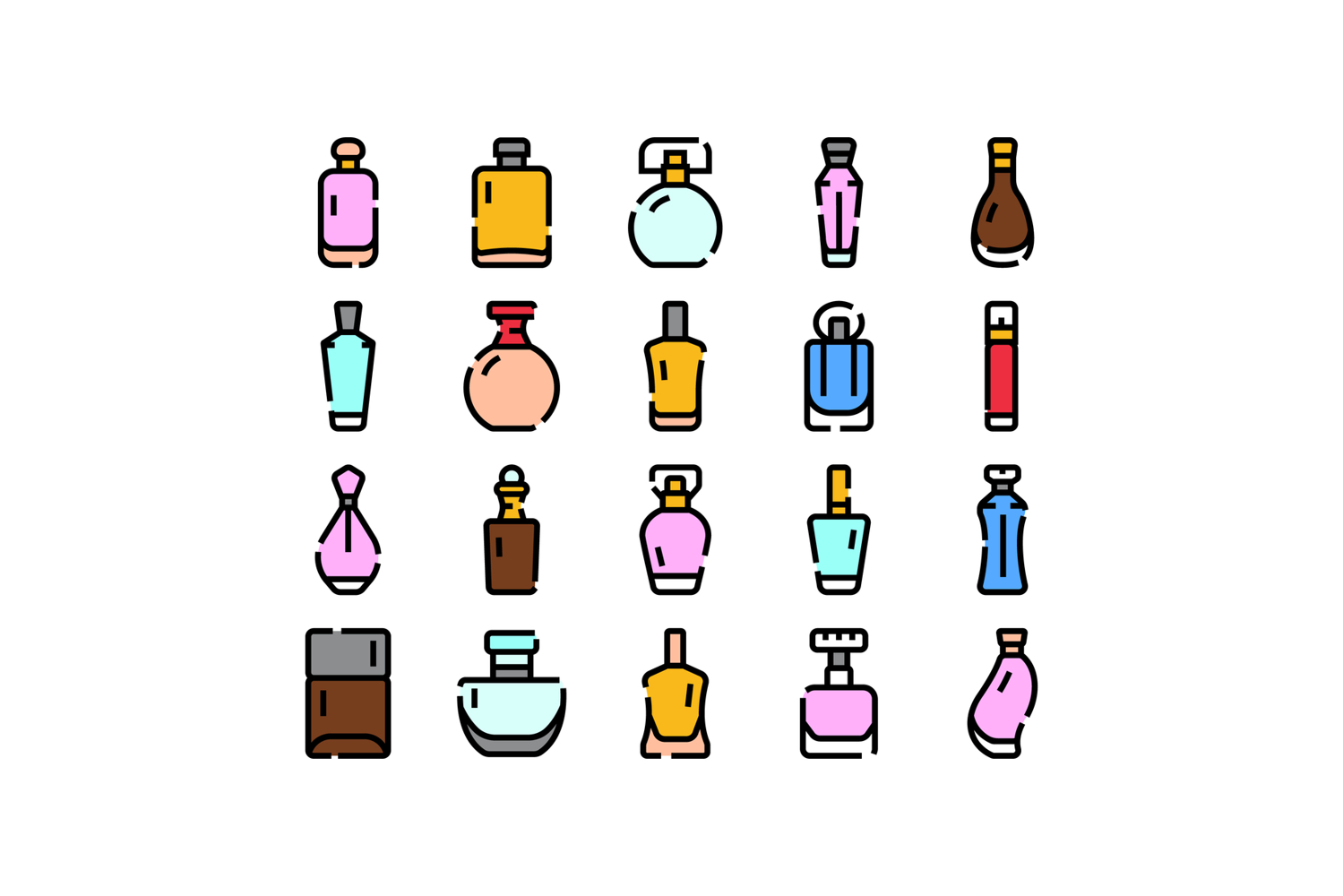 Perfume bottles illustrated in a flat outline style, displaying various shapes and forms representing cosmetic scents, elegant beauty products, and care items