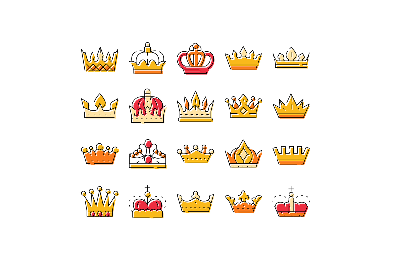 Crowns icons set featuring various styles for kings, queens, and nobility, symbolizing monarchy, authority, power, luxury, achievement, and leadership on a white background