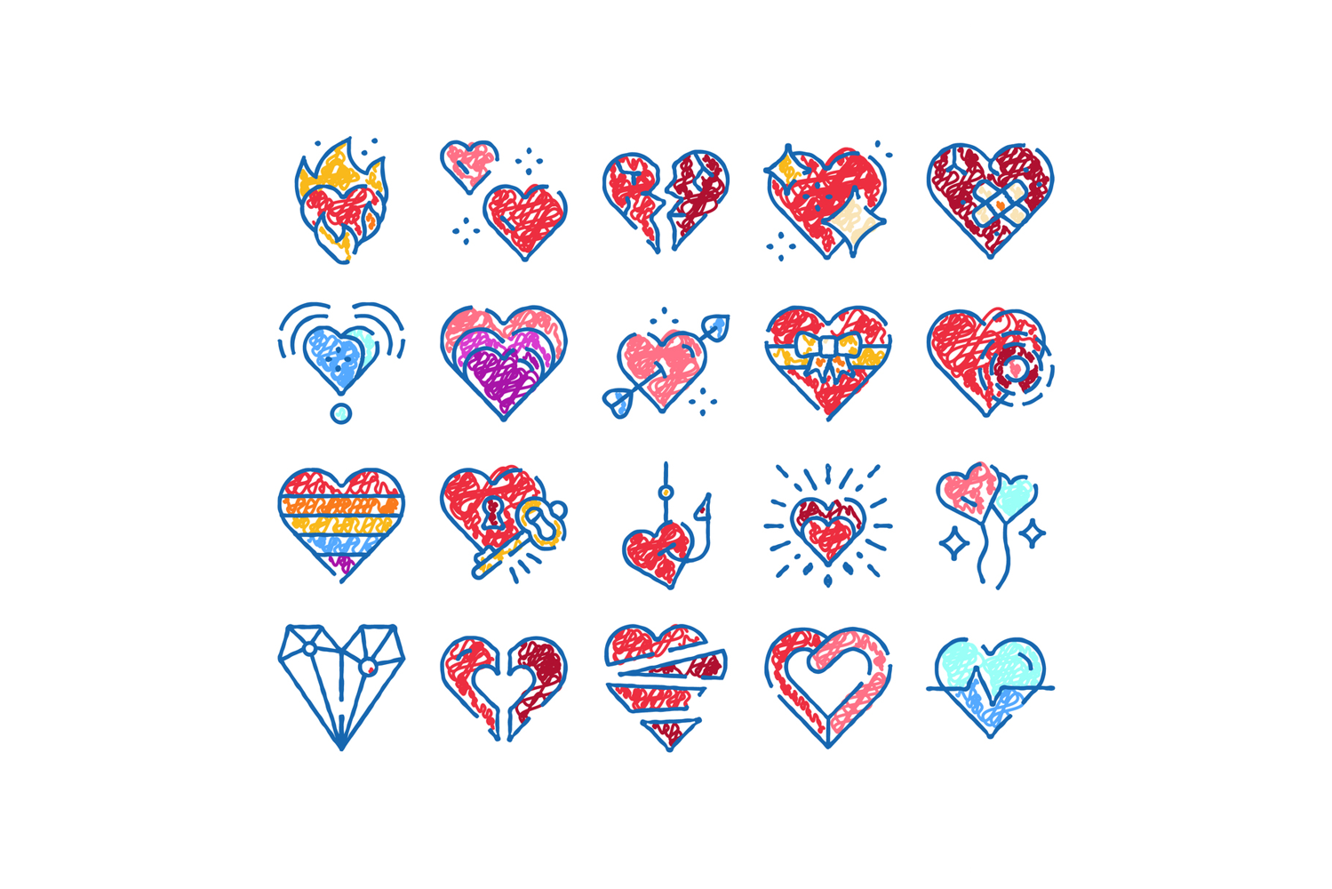 Collection of colorful heart vector drawing doodles representing love, romance, passion, sadness, and various relationship concepts, isolated on a clean white background