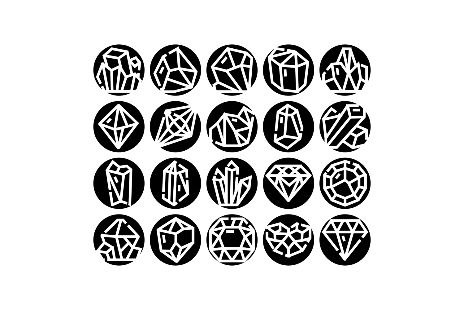 Twenty black and white circular icons showing various abstract geometric shapes representing crystals, minerals, and faceted gemstones, ideal for design elements