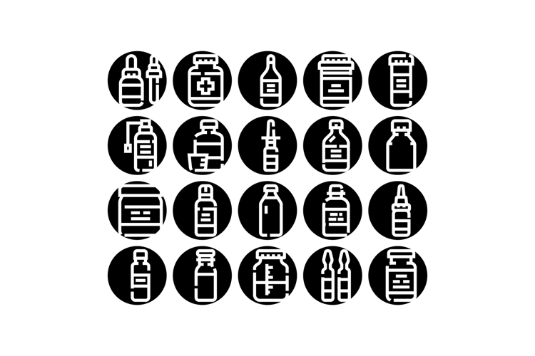 Pharmacy medicine containers line icon set illustrating various types of drug packaging, representing healthcare, pharmaceutical industry, and medication dispenser concepts