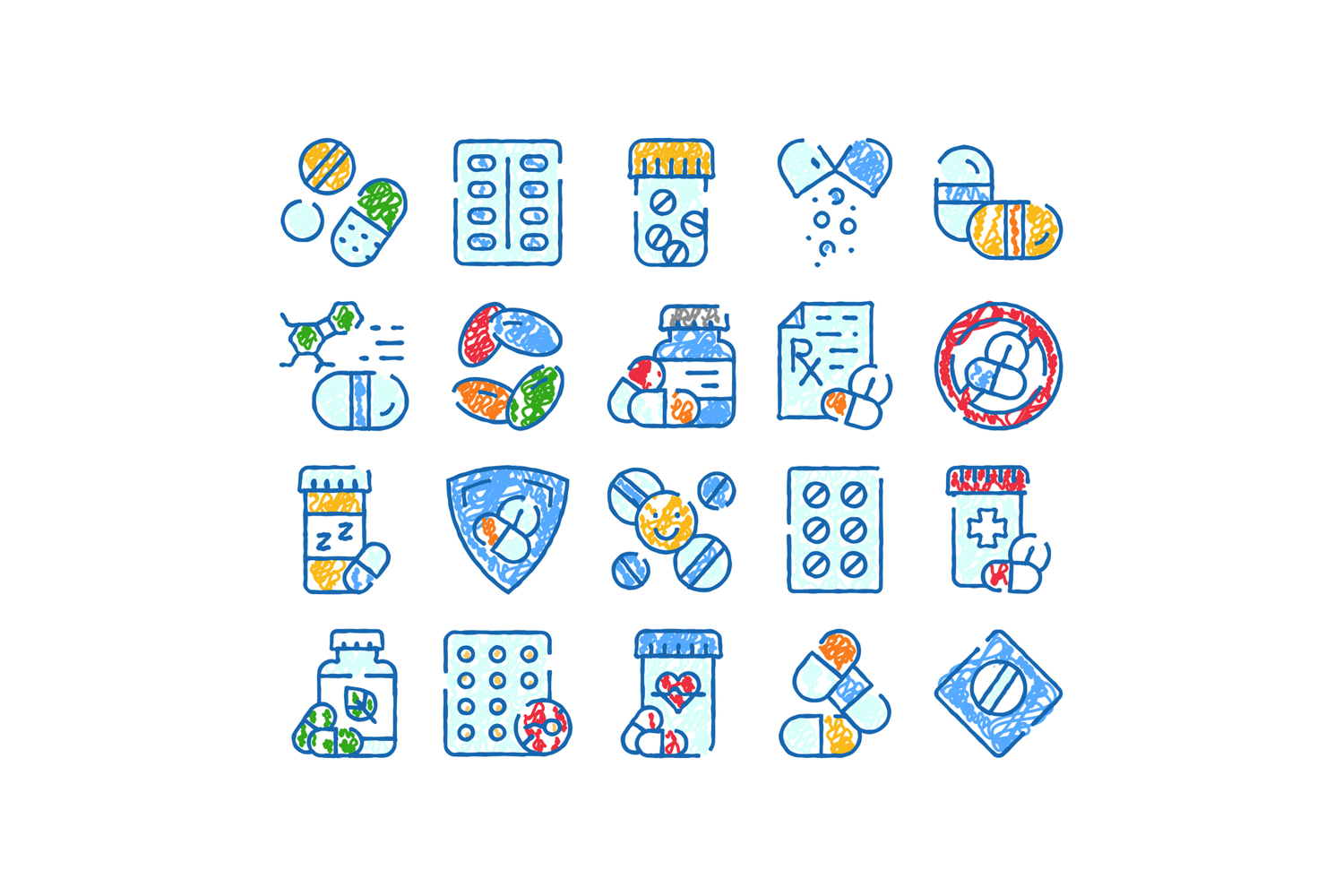 Assortment of hand drawn style icons depicting various pills, capsules, bottles, blasters, and medical concepts, illustrating healthcare, pharmacy, treatment, and wellness services