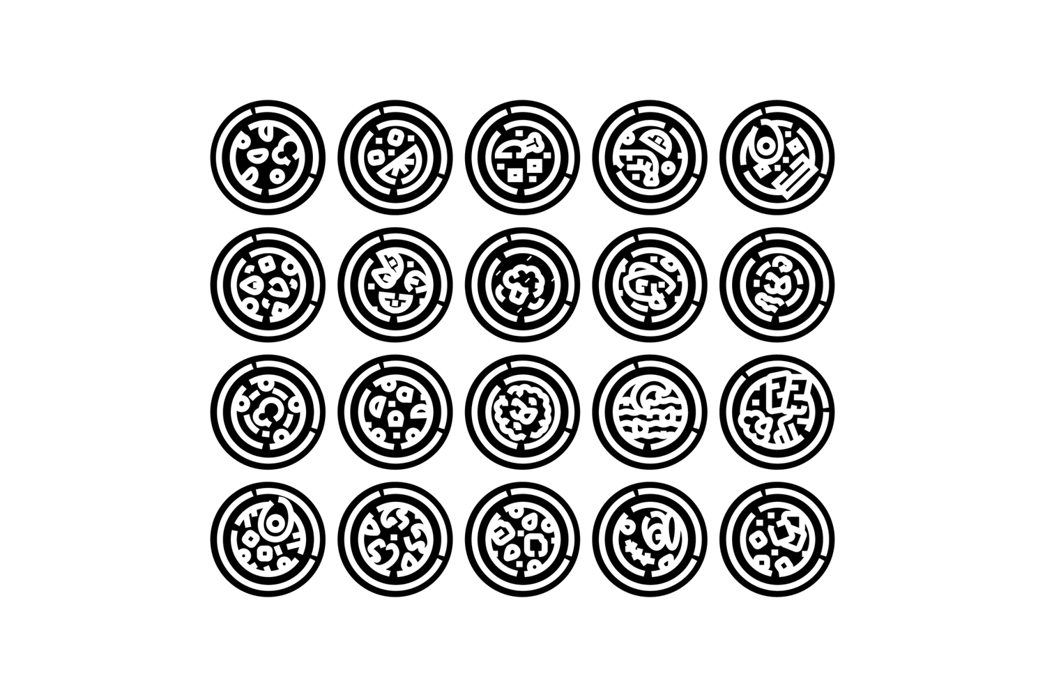Collection of stylized black and white pizza icons showcasing various toppings and abstract food elements, ideal for menus, apps, and graphic design projects
