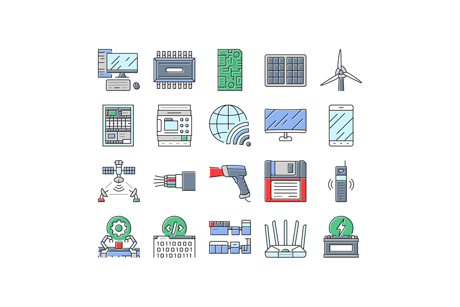 industry 3.0 cybernetics sensors icons set vector. data analytics, ai machinelearning, connectivity, efficiency, innovation industry 3.0 cybernetics sensors color line illustrations