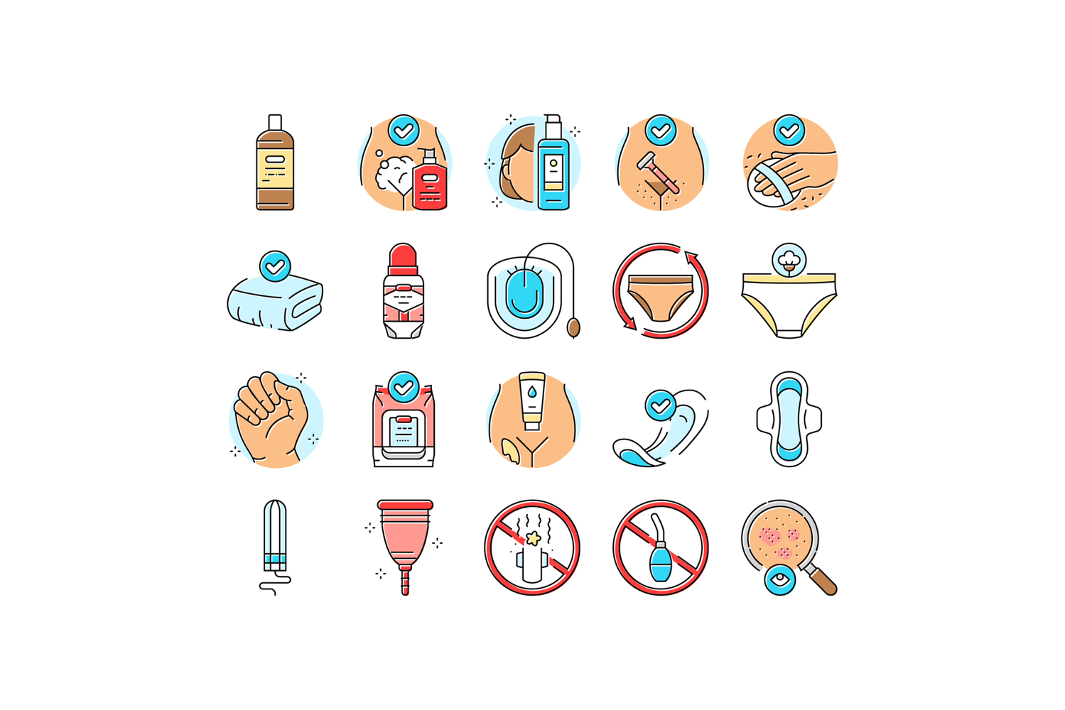 female intimate care hygiene icons set vector. menstruation periods, menstrual, wellness, health comfort protection, cleanliness female intimate care hygiene color line illustrations
