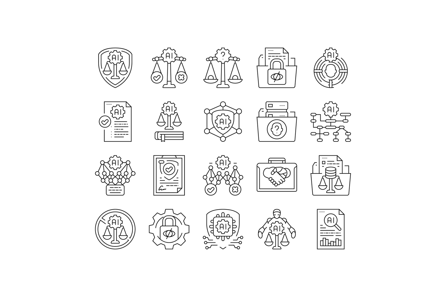 ethical ai bias transparency icons set vector. accountability, fairness privacy, consent trust safety inclusivity, equity ethical ai bias transparency black contour illustrations