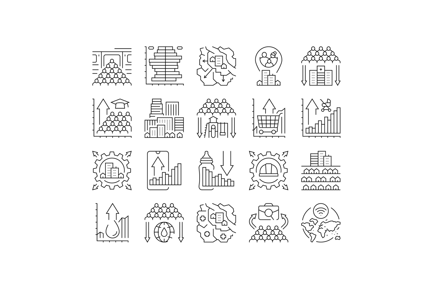 population growth icons set vector. demographics urbanization, overpopulation resources, migration, fertility, mortality population growth black contour illustrations