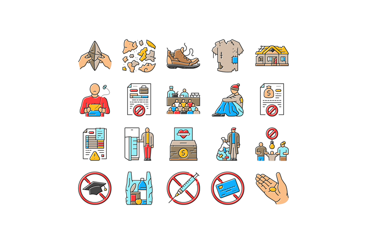 poverty inequality unemployment icons set vector. homelessness hunger, education, healthcare, aid development, empowerment, disparity poverty inequality unemployment color line illustrations