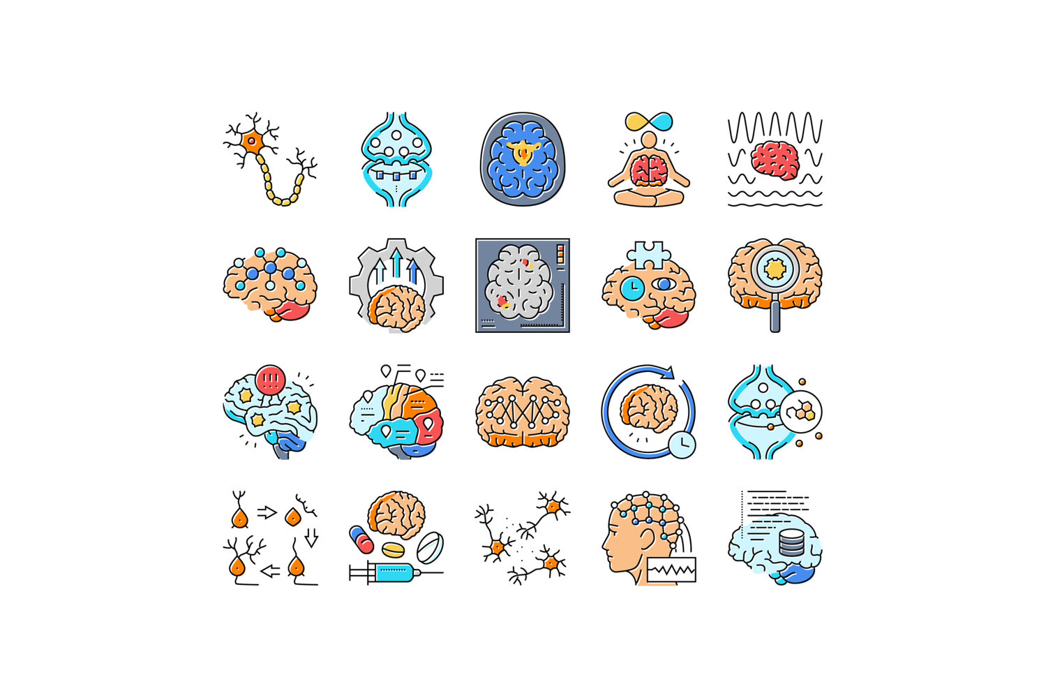 neuroscience brain neurology icons set vector. research medical, doctor technology, science health, neurosurgery scan, computer neuroscience brain neurology color line illustrations