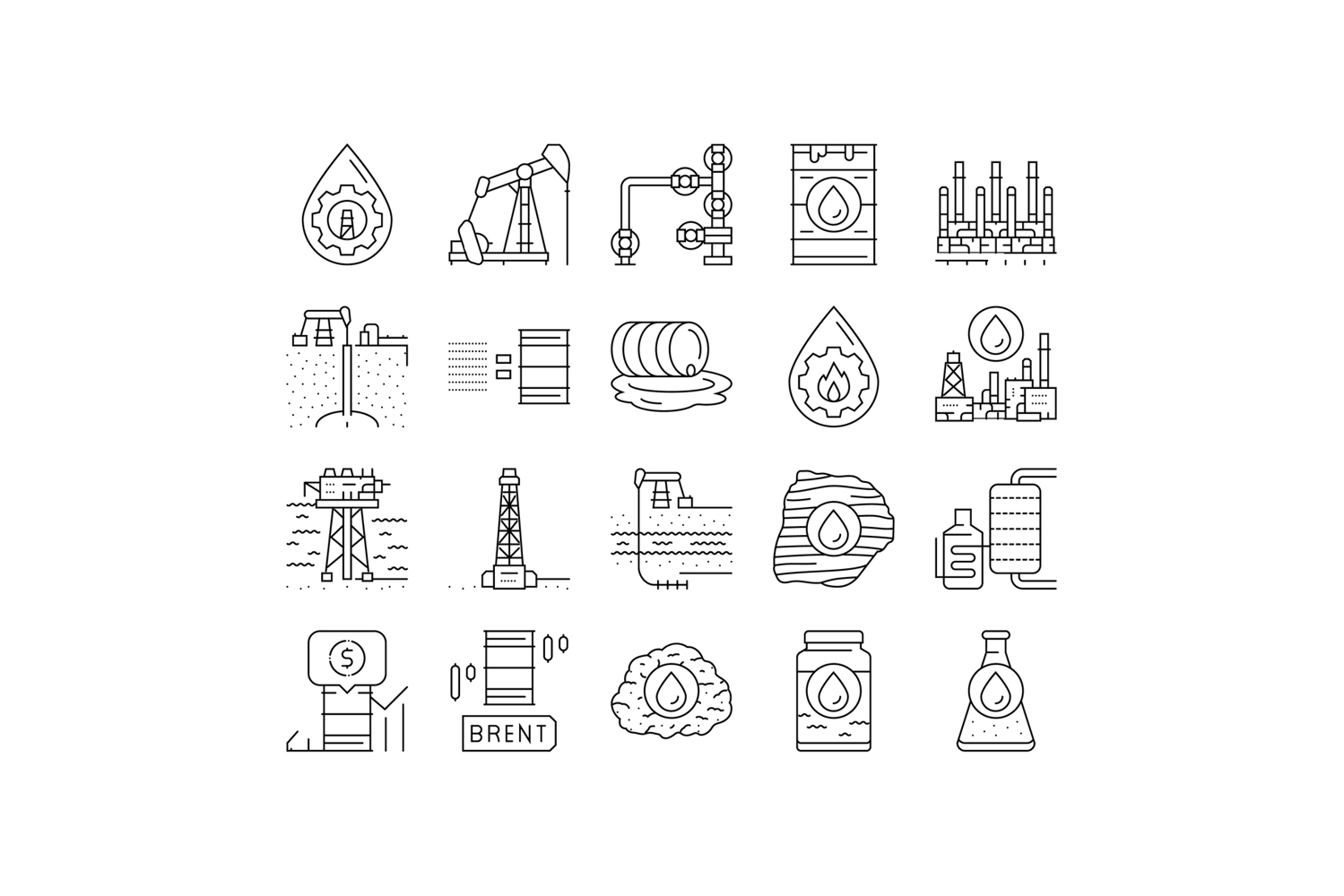 oil industry factory plant icons set vector. refinery energy, production power, pipe environment, chemical, fuel, worker engineer oil industry factory plant black contour illustrations