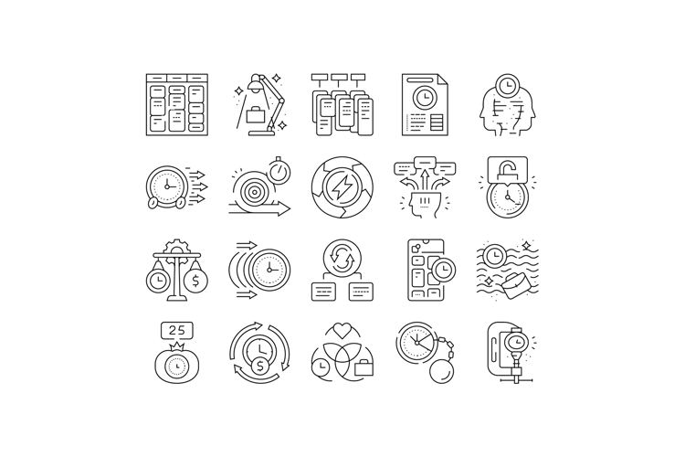 time management clock work icons set vector. business office, watch hourglass, timer calendar, schedule laptop, computer sand time management clock work black contour illustrations