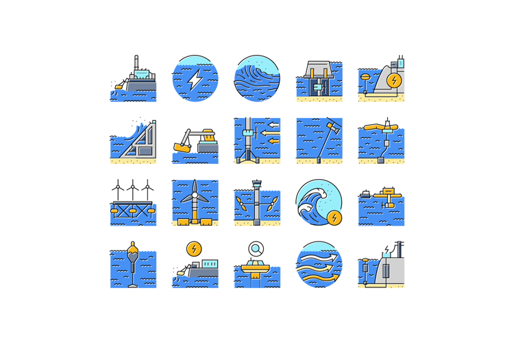wave energy power tidal icons set vector. sea plant, hydro electric, tide generation, station water turbine, lake electricity wave energy power tidal color line illustrations