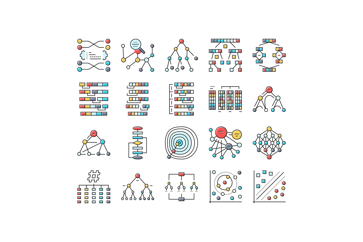 algorithm data technology ai icons set vector. software digital, computer process, information security, web financial, network algorithm data technology ai color line illustrations