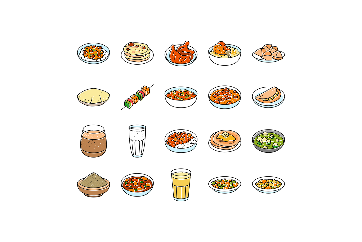indian cuisine food curry icons set vector. restaurant india, masala chicken, asian tikka, rice traditional, paneer, dish indian cuisine food curry color line illustrations