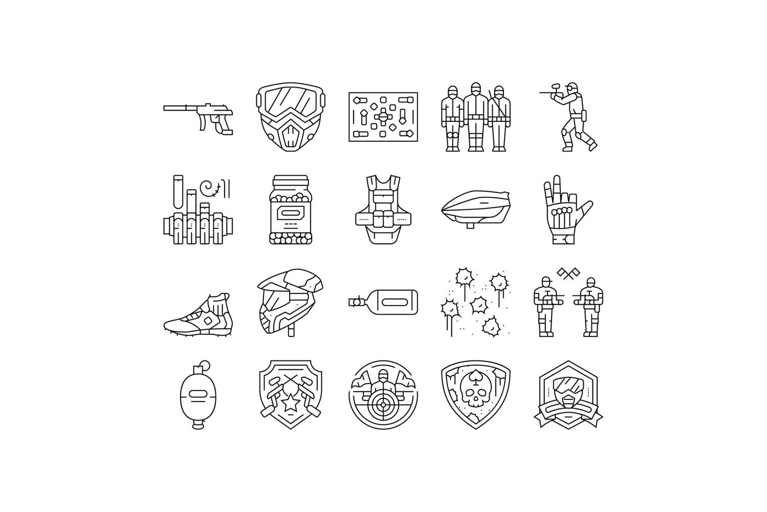 paintball game player team icons set vector. ball paint, target gun, friends fun, splash group, military adrenaline, splatter paintball game player team black contour illustrations