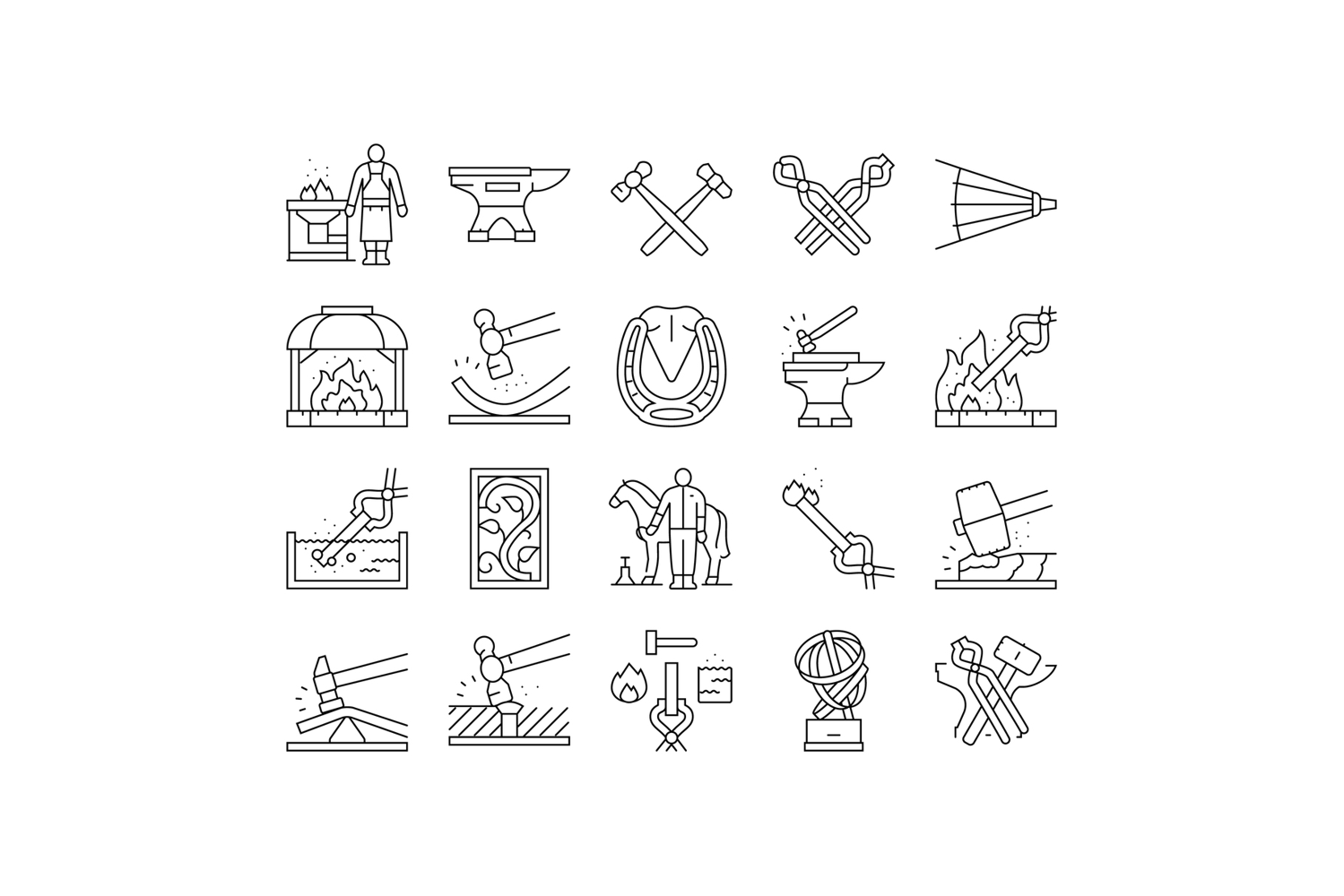 blacksmith forge anvil hammer icons set vector. smith metal, smithy craftsman, fire steel, work farrier, black forging, sword strike blacksmith forge anvil hammer black contour illustrations