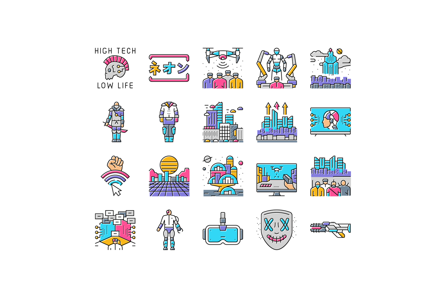cyberpunk digital city future icons set vector. cyber technology, modern street, night light, building urban, fantasy, town blue cyberpunk digital city future color line illustrations
