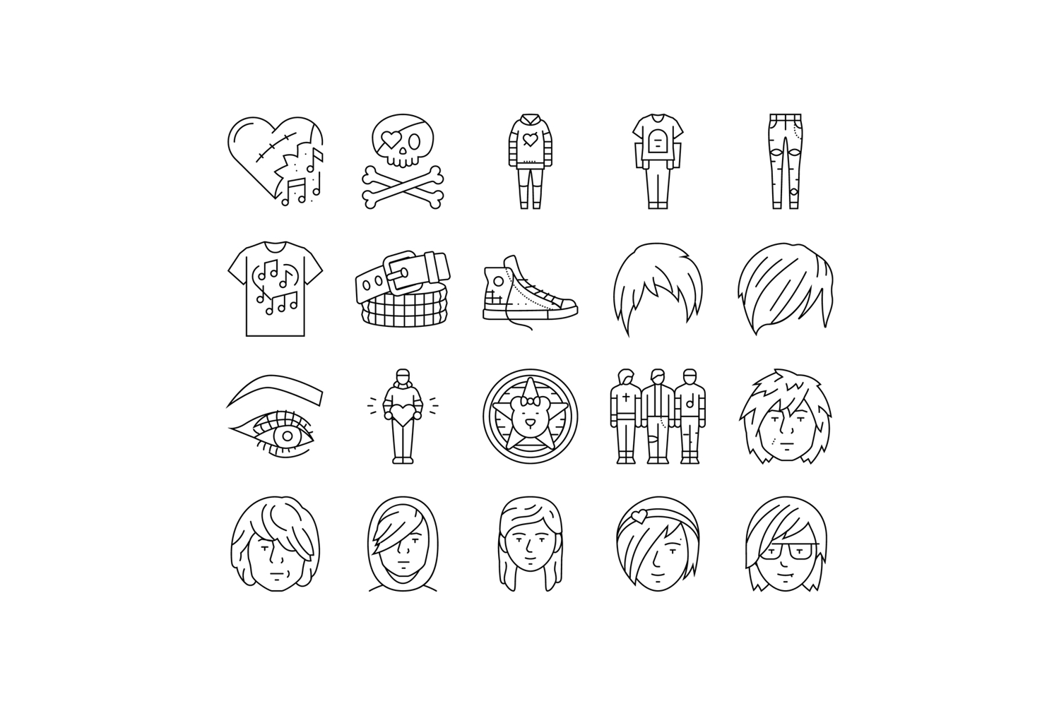 emo punk rock tattoo cute icons set vector. fire sticker, goth gothic, skull music, girl grafitti, love scribble star emo punk rock tattoo cute black contour illustrations