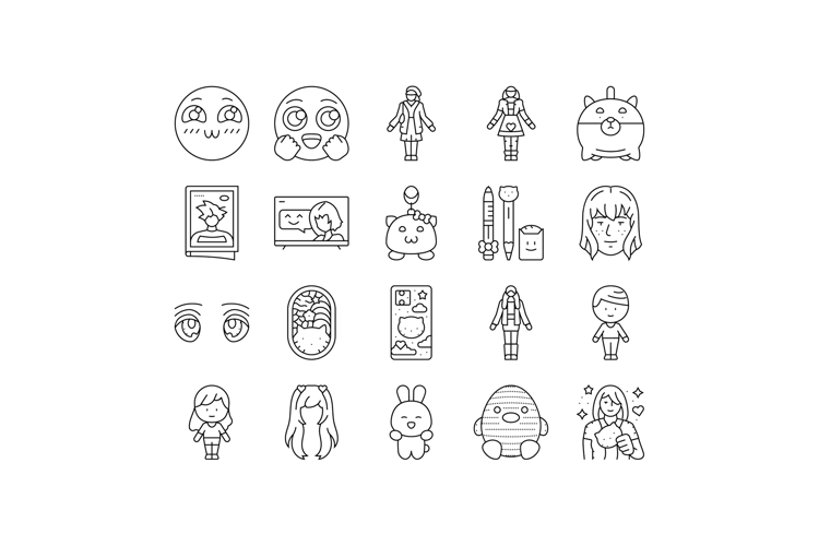 kawaii cute anime emoticon icons set vector. girl manga, rainbow art, game face, girly gamer, candy sticker, star smile kawaii cute anime emoticon black contour illustrations