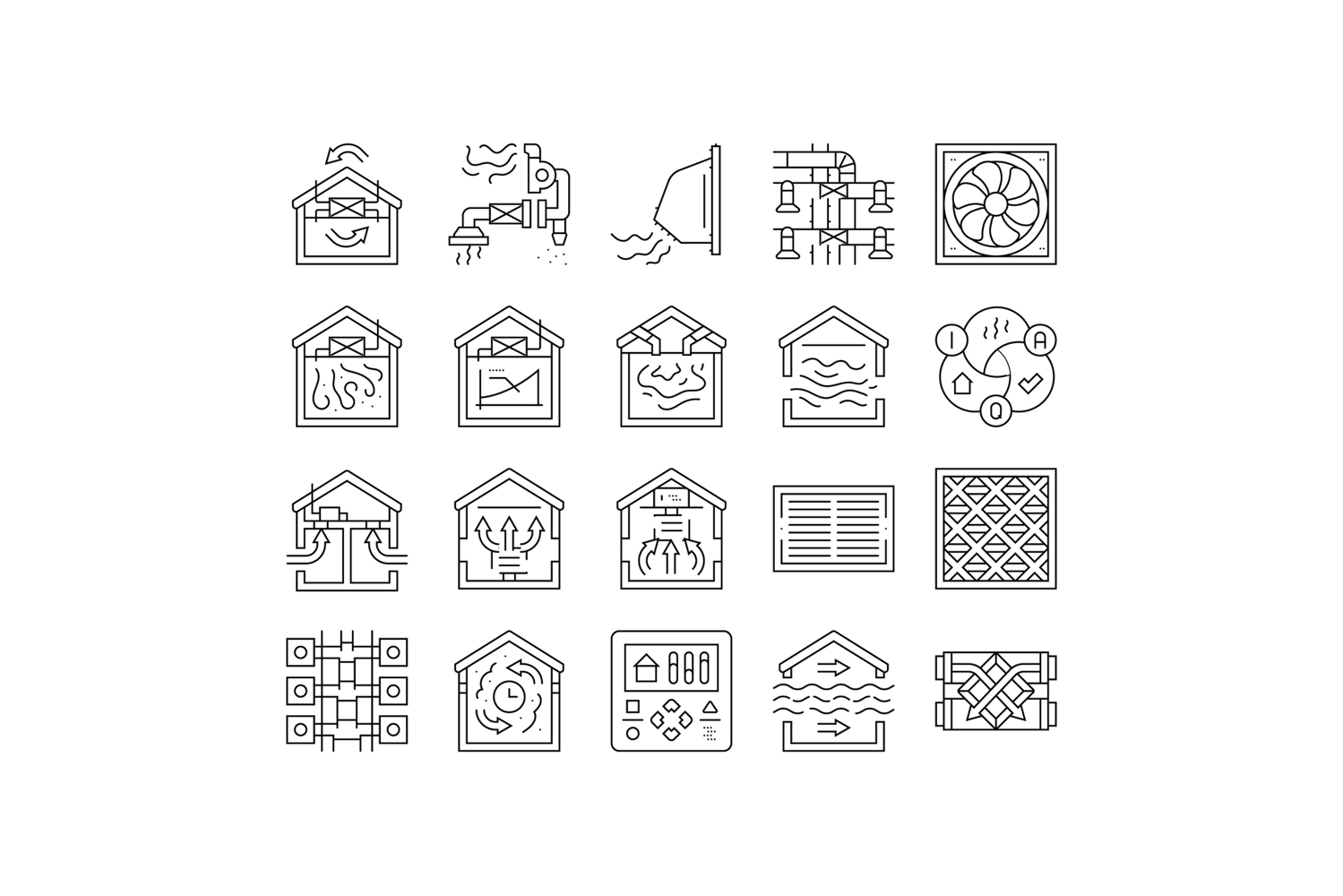 air ventilation cold fan icons set vector. conditioner wind, heat climate, condition hot, flow house, control system technology air ventilation cold fan black contour illustrations