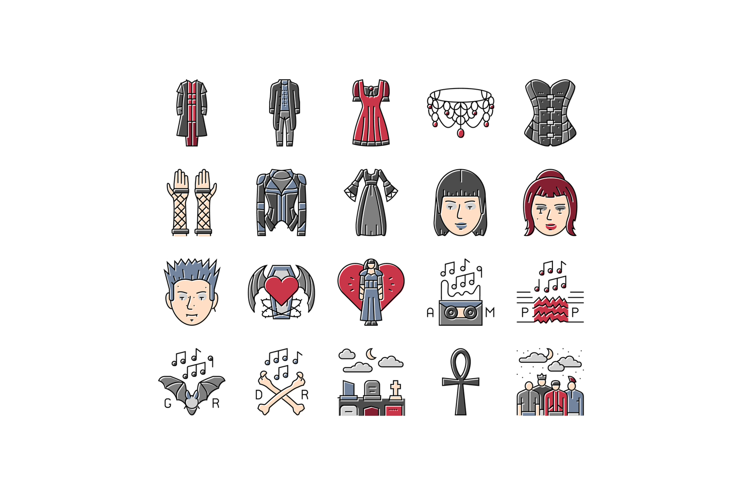 goth subculture punk gothic y2k icons set vector. heart tattoo, flame girl, people rocker, man metal, couple fire, woman graffiti goth subculture punk gothic y2k color line illustrations