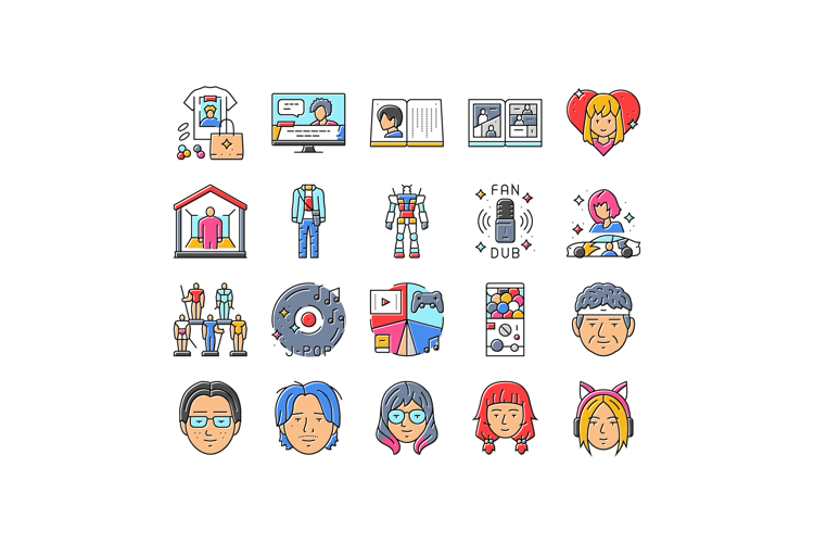 otaku anime manga eyes icons set vector. japanese, japan piece, one boy, asian concert, shirt cosplay, cheering cat, samurai otaku anime manga eyes color line illustrations