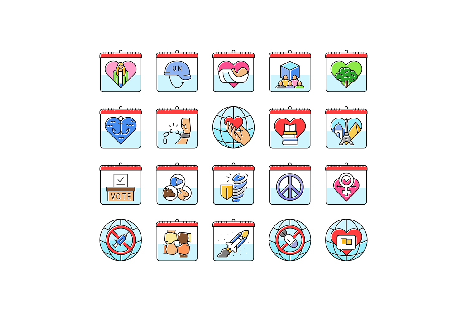 international holiday day icons set vector. girl child, peacekeepers, midwife, cooperatives, forests, seafarer, victims slavery international holiday day color line illustrations