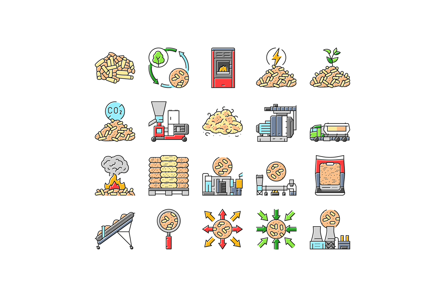 wood pellets timber plywood icons set vector. chip granule, energy fuel, tree panel, biomass pulp, alternative paper, cardboard wood pellets timber plywood color line illustrations