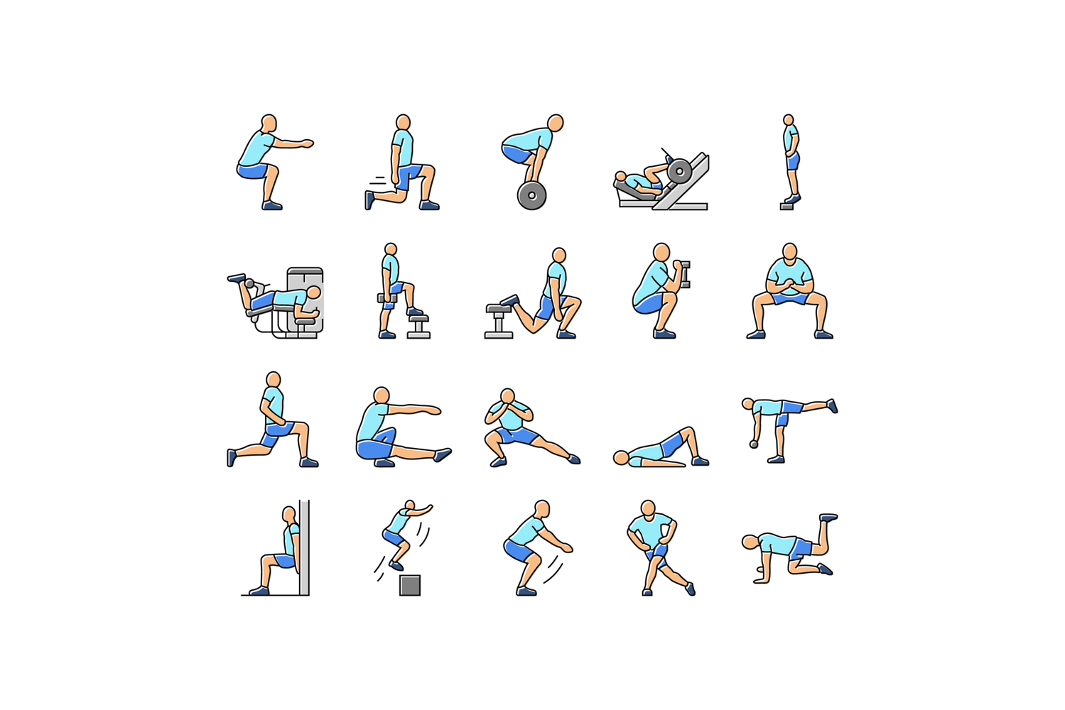 fitness exercises leg icons set vector. sport workout, body training, health, healthy young person, fit gym, athlete active fitness exercises leg color line illustrations