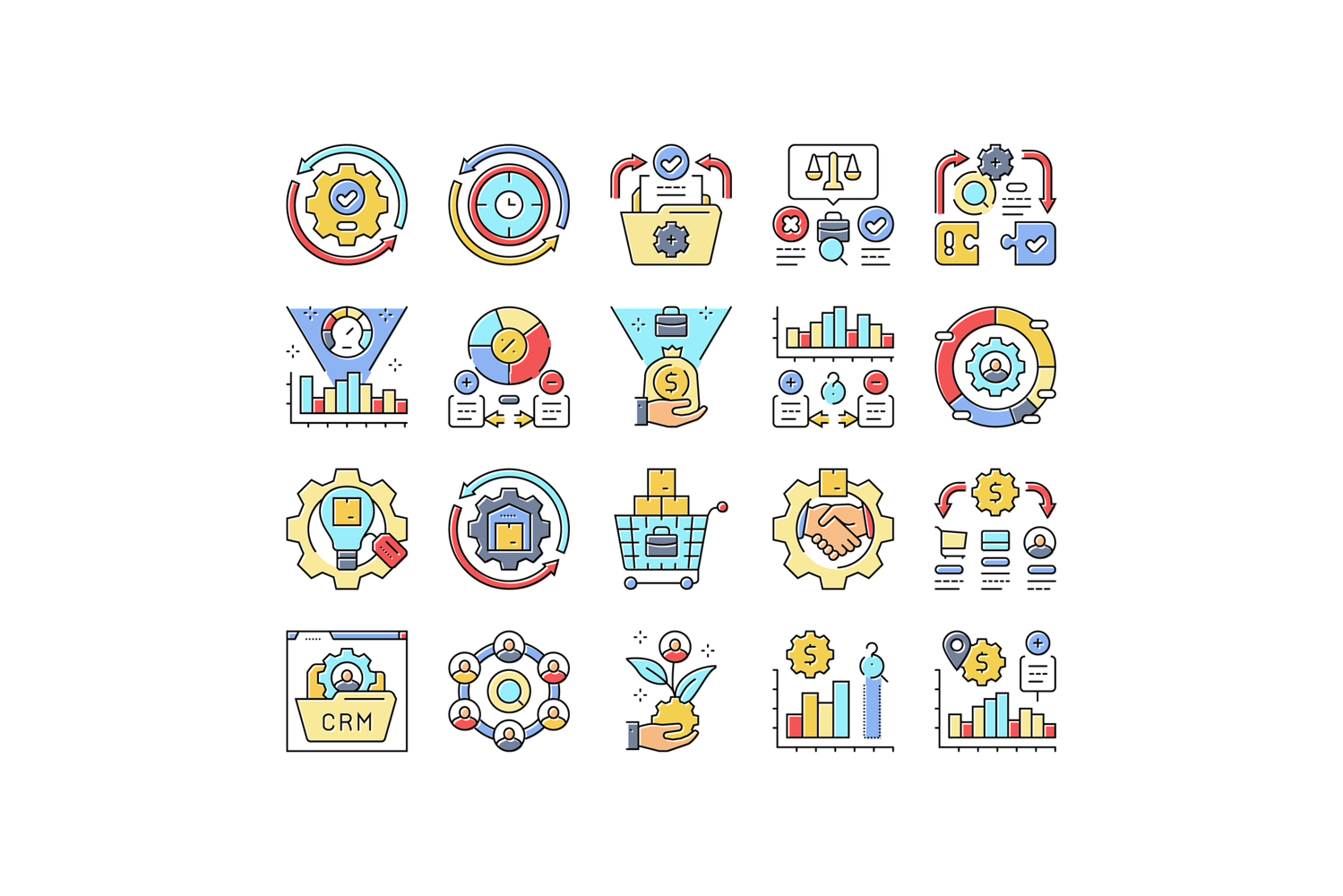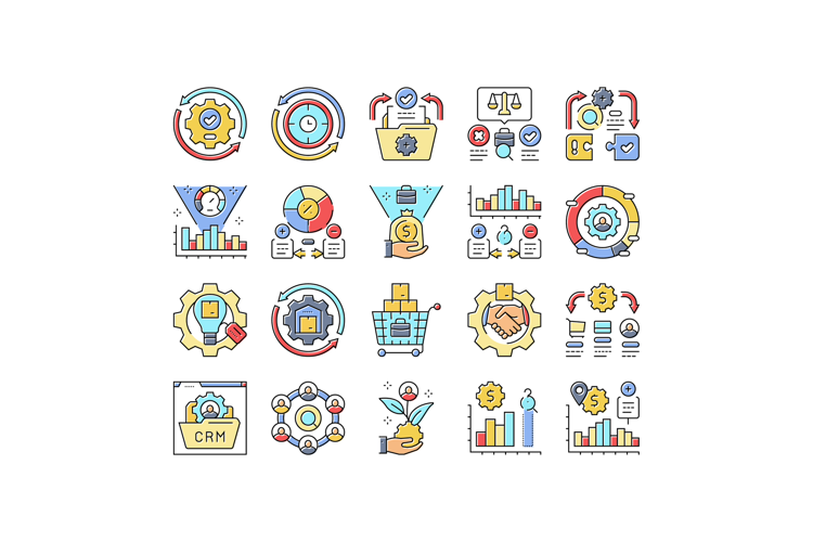 business process efficiency icons set vector. automation optimization, workflow strategy, innovation management integration business process efficiency color line illustrations
