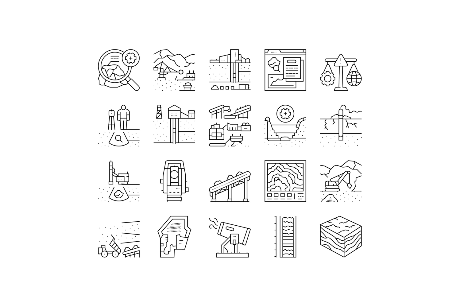 mining engineer geology icons set vector. minerals excavation, drilling blasting, surveying safety, equipment, operations mining engineer geology black contour illustrations