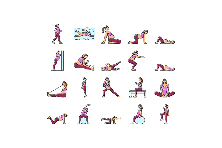 pregnant fitness icons set vector. exercise yoga, strength flexibility, wellness health, balance stamina, nutrition pregnant fitness color line illustrations